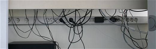 De oplossing is echt geniaal: een klik-systeem gebaseerd op een rail waarin je stopcontact-units kan schuiven. Op deze manier heb ik nu de beschikking over 16 gewone stopcontacten, en 12 euro-stopcontacten. Woei: 28 stopcontacten. Eindelijk, voor het eerst sinds 15 jaar: genoeg stopcontacten (onder m’n bureau dan, in de rest van het huis is het een ander verhaal). Echt een geweldig systeem, en ik kan het eigenlijk iedereen aanraden.