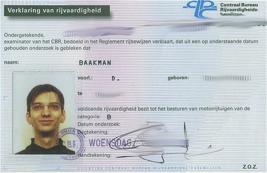Vandaag geslaagd voor m’n rij-examen! De lessen de afgelopen dagen gingen allemaal redelijk matigjes, maar het examen ging gewoon goed. Geen echte fouten gemaakt (tenzij je 1) het rijden van 55 km/h op een 80 km/h weg die net 2 auto’s breed is, vol met gaten zit, en vol met plassen water ligt, bol loopt, aan beide kanten vol met bomen en aan beide kanten een sloot als ‘fout’ ziet (de examinator vond het in ieder geval wel nodig om er iets van te zeggen); ik vond (en vind) harder rijden op zo’n wegdek niet echt verantwoord, het feit dat toen hij er iets van zij en ik harder ging rijden ik en een tegenligger vol in de ankers moesten en redelijk rakelings langs elkaar reden getuigt daar eigenlijk wel van, 2) het in eerste instantie afremmen voor een oranje stoplicht terwijl achteraf wel duidelijk was dat dat niet zo’n nuttige keuze was (na 0.2 seconde remmen had ik dat ook wel door en ik had nog voordat hij er iets over gezegd had m’n rem al weer los om nog ruim door oranje te rijden)). Wel enigzins mazzel gehad dat er niet veel twijfelmomenten-mogelijkheden waren: ‘t was altijd duidelijk of ik voor of achter iemand terecht kon bij het invoegen (dat was bij de eerste poging wel anders…), en bij auto’s van rechts ook altijd of erg dichtbij of erg ver weg nog. Toch wel een beter moment, afrijden om 13:00 ipv om 08:00… dat scheelt wel behoorlijk.