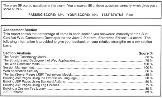 Uiteindelijk een score van 79% gehaald. Wel een score waar ik best tevreden mee ben. Niet zo hoog als m’n Sun Certified Java Programmer score, maar naar mijn mening wel hoog genoeg :) Wel grappig om te zien dat m’n scores op de JSP-onderdelen en Java security significant lager liggen dan de rest, blijkbaar scheelt het toch wel, als je dat soort zaken in je dagelijkse werk nooit gebruikt.