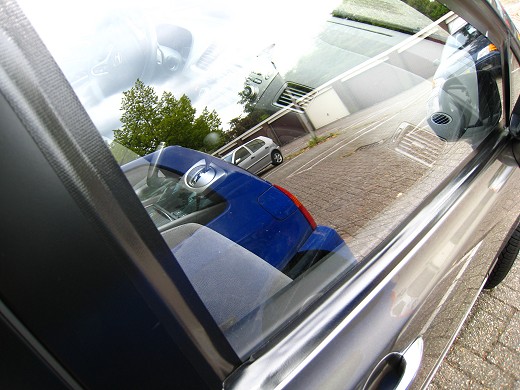 Toen ik woensdag naar de opticien wou en naar de tram liep zag ik het al meteen: de linkervoorruit was afgeplakt met plastic. Dat kon maar 1 ding betekenen: de ruit was ingeslagen. Even naar m’n auto gelopen, en ja, hoor. Iemand had de ruit ingeslagen in de hoop iets nuttigs aan te treffen in m’n auto. Blijkbaar was m’n oude bril, m’n instructieboekje of m’n parkeerschijf niet interessant genoeg, want alles was er nog… Een flatbewoner (of althans, dat denk ik in ieder geval) heeft dit (geruime tijd) voor mij gemerkt, en heeft de ruit met een vuilniszak afgeplakt (waarvoor dank!).