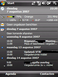 – BatteryStatus: Plugin voor op het Today scherm. Geeft naast de status van de batterij (die weet ik al door Batti) ook je provider waarmee je verbonden bent, je GSM verbindingssterkte, de temperatuur, je CPU snelheid weer.