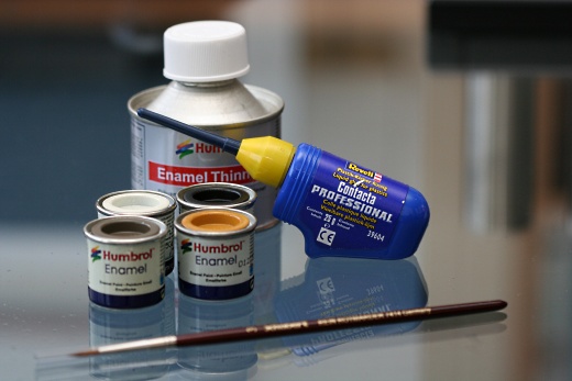 Dus de eerste stap is het verzorgen van de benodigdheden. Op naar een hobby-winkel dus. Zaterdag sta ik dan ook met een rijtje kleurnummers van potjes verf die ik nodig heb. Kwastje erbij, en lijm. Ook maar wat verdunning meegenomen (jaja, ik weet het… van dat laatste kan ik misschien beter gewoon 100ml bij m’n vader bietsen, maar ja, om daar nou 100 km voor te gaan rijden is ook al weer zowat…).