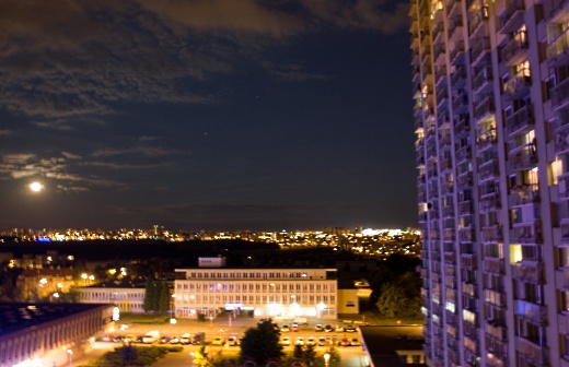 Ik heb echt geen flauw idee waarom die flat op de foto zo’n ontzettend paarse gloed heeft. Volgens mij is het gebouw in het echt groen. Zou het de zonsondergang zijn, de neon-verlichting van het gebouw aan de overkant, of heeft mijn camera hier qua kleurbalans een beetje lopen blunderen?