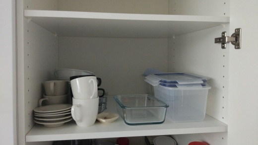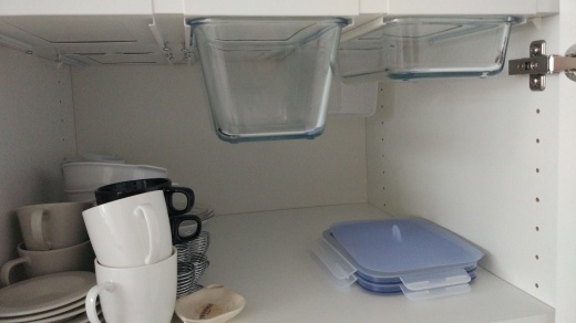 Anyway, we bought some Ikea 365 containers. In the shop we also saw an interesting way to hang them under a kitchen shelf. Didn't really gave to much attention, but at home, we thought: he, that might be something for us, on the shelf where we store those containers, we don't use all the space.