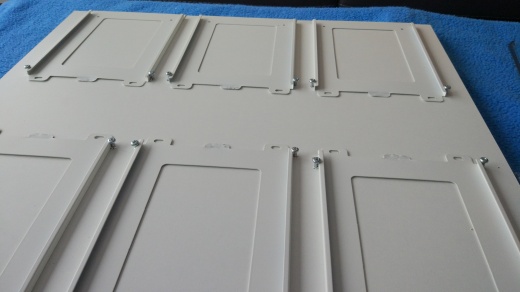 So, aligning all 6 under a shelf, and just some screws... Hmm.... When I would screw them in the shelf as intended, the containers still wouldn't slide from one to another. So, final construction is a bit 'not-that-perfect' where I kindoff hang the holders between two screws.